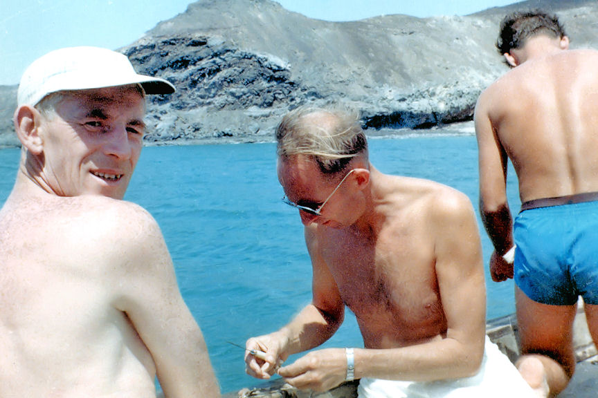 The Bennett brothers in Conquest Bay in 1961 with Mick (right) taking the mickie out of Ben's Knife sheath. (Ben Bennett)
